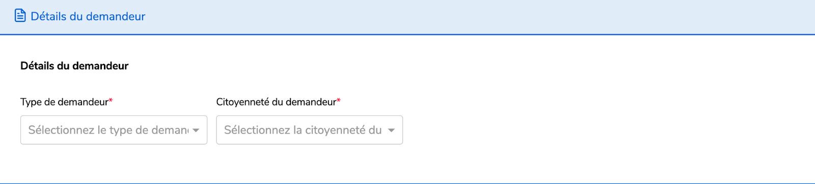 Remplissez les détails du demandeur,tel que le type et la citoyenneté du demandeur.