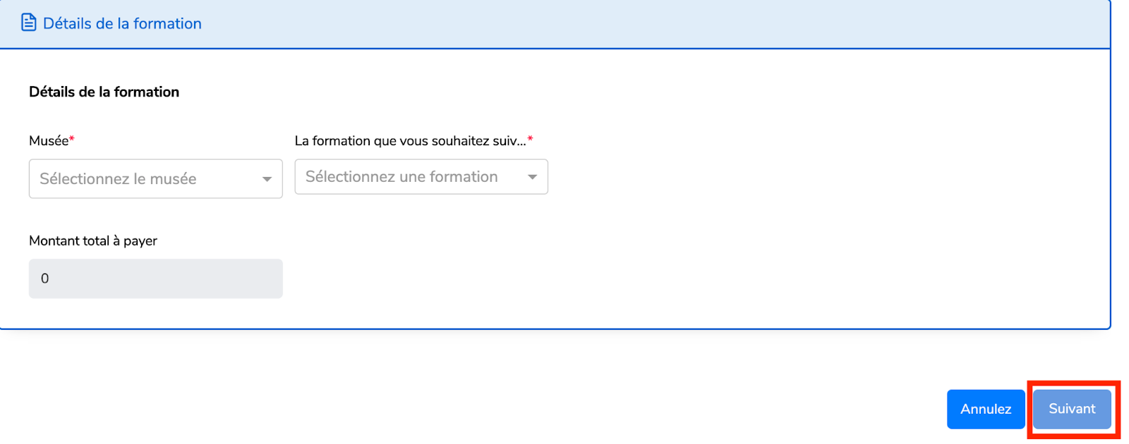Remplissez les détails de la formation ce qui inclut le musée dans laquelle l’expérience pratique sera conduite ,la formation que vous souhaitez suivre et vous aurez le montant total à payer selon la période de formation( jours ou mois), puis cliquez sur “Suivant”.
