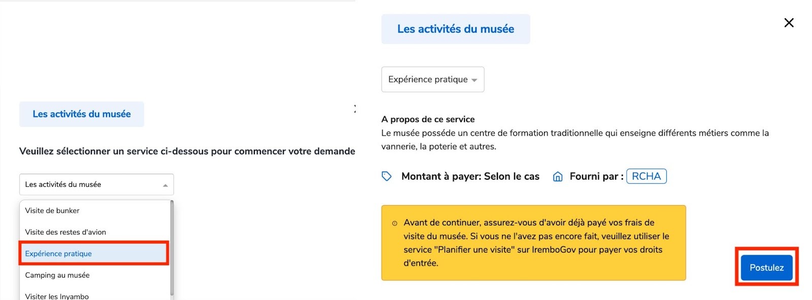 NOTE: Veuillez vous assurer d'avoir payé vos frais de visite du musée avant de continuer. Si vous ne l'avez pas encore fait, veuillez utiliser le service « Planifier une visite » sur IremboGov pour régler vos frais d'entrée.