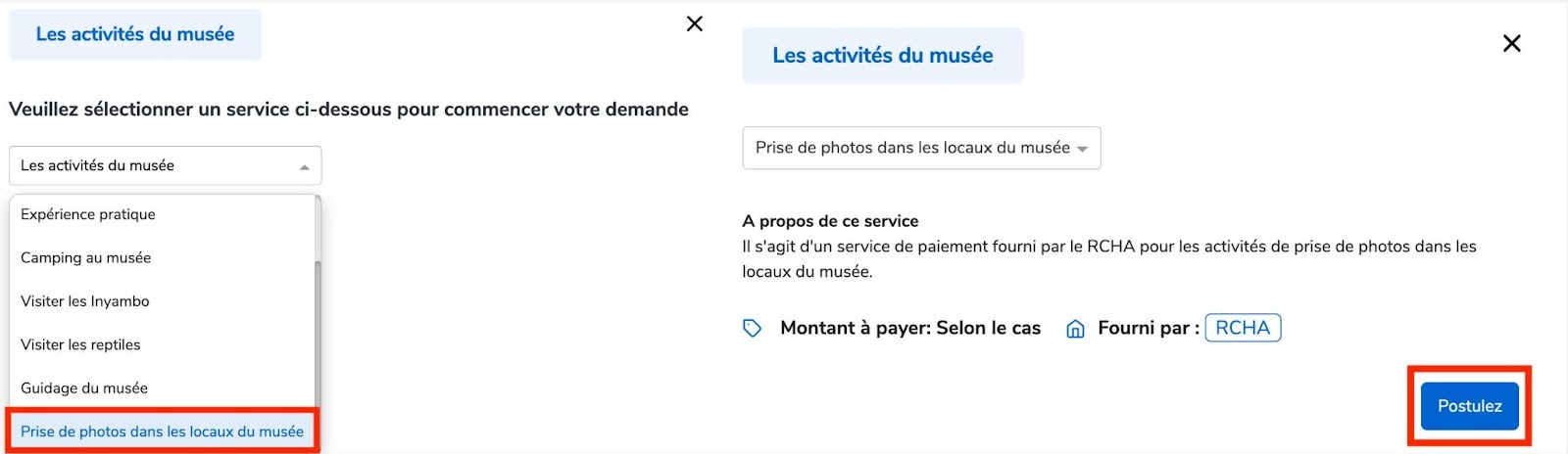 Sélectionnez “Prise de photos dans les locaux du musée”,puis cliquez sur “Postulez”.