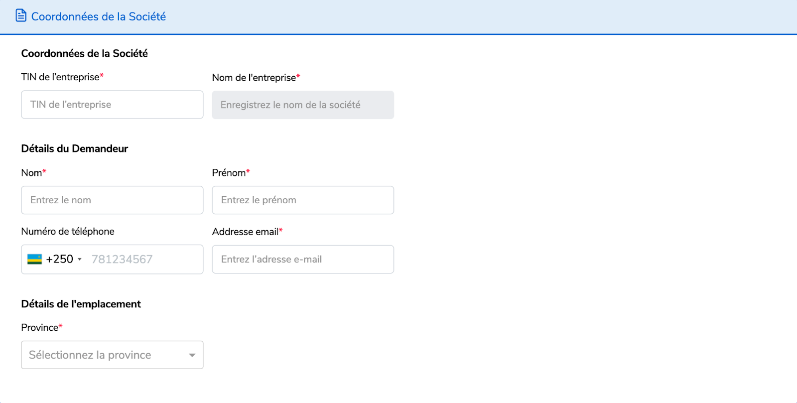 Remplissez les coordonnées de la société en incluant détails du demandeur et l’emplacement.