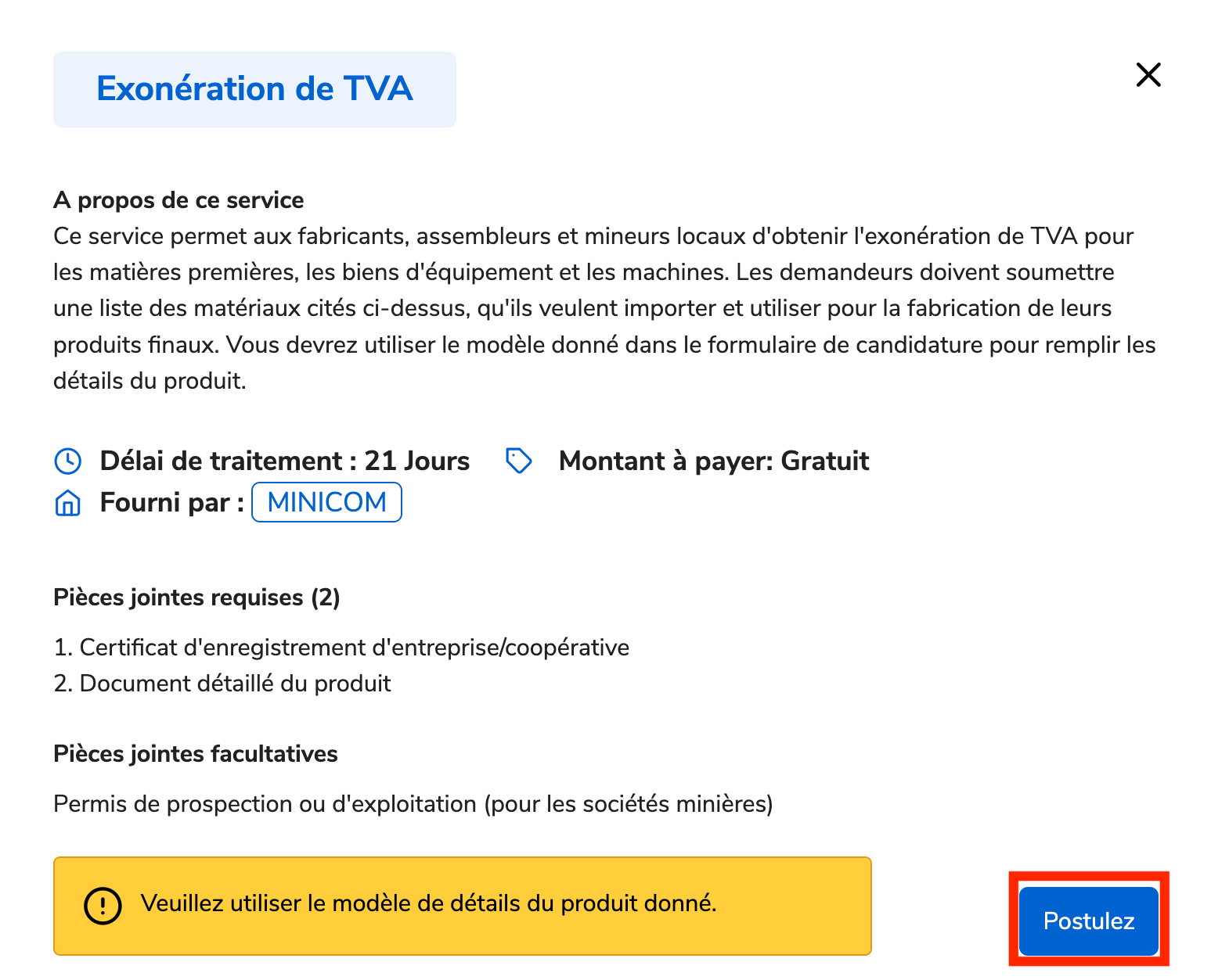 Ce service permet aux fabricants, assembleurs et mineurs locaux d'obtenir l'exonération de TVA pour les matières premières, les biens d'équipement et les machines. Les demandeurs doivent soumettre une liste des matériaux cités ci-dessus, qu'ils veulent importer et utiliser pour la fabrication de leurs produits finaux. Vous devrez utiliser le modèle donné dans le formulaire de candidature pour remplir les détails du produit. Ce service est fourni par le ministère du commerce et de l’industrie(MINICOM).