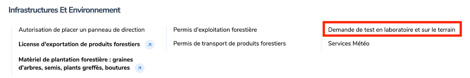 1. Rendez-vous sur www.irembo.gov.rw , dans la categorie “Infrastructures  et  Environments”,choisissez “Demande de test laboratoire et sur le terrain.”
