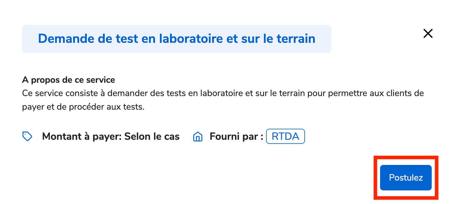 Ce service consiste à demander des tests en laboratoire et sur le terrain pour permettre aux clients de payer et de procéder aux tests. Ce service est destiné aux individus , aux sociétés privées et aux institutions  gouvernementales souhaitant tester les matériaux utilisés dans les projets d'infrastructure. Ce service est fourni par L’OFFICE RWANDAIS POUR LA PROMOTION DU DÉVELOPPEMENT DU TRANSPORT (RTDA).