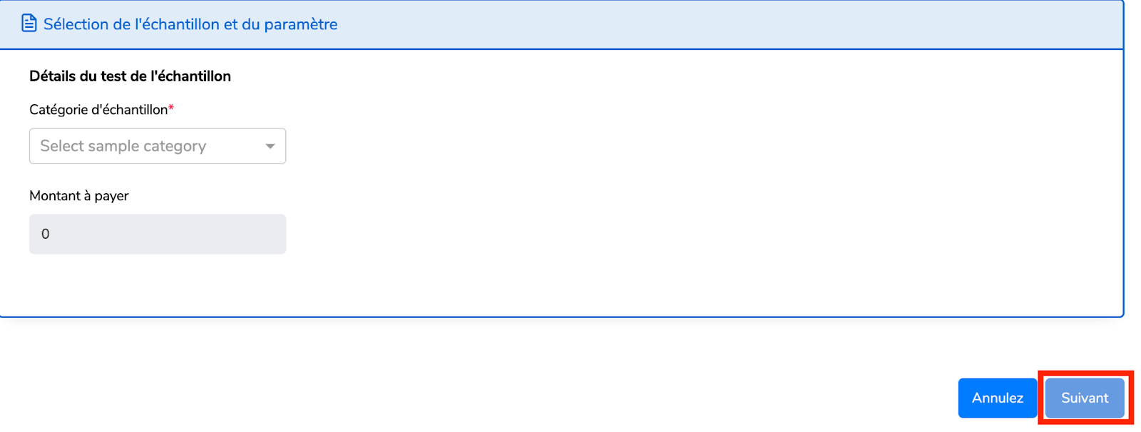 1. Remplissez les  détails du test et de l'échantillon en sélectionnant la catégorie d'échantillon et du paramètre,et vous aurez un montant à payer,puis cliquez sur “Suivant”.