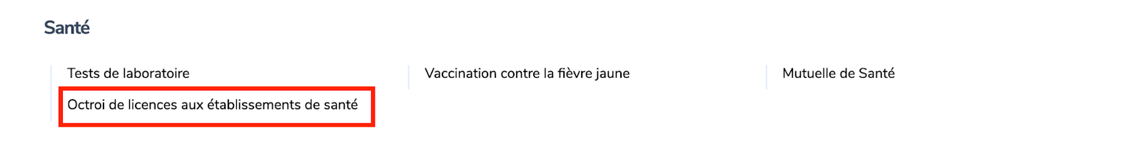Étape 1 : Accédez à www.irembo.gov.rw et, sous la rubrique “Santé” , cliquez sur Octroi de licences aux établissements de santé.