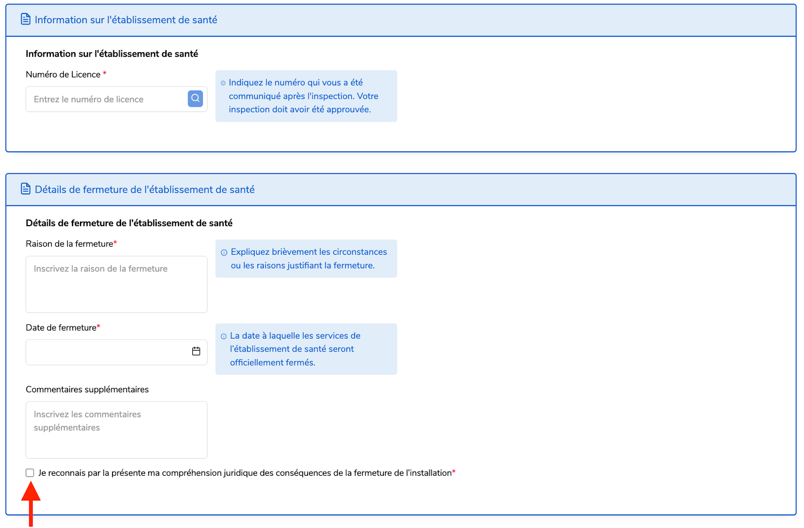 Étape 4 : Saisissez le numéro de licence et les informations relatives à l’établissement (y compris le motif de la fermeture et la date prévue de cessation des services), puis cochez la case de vérification.