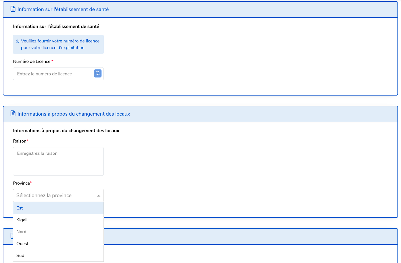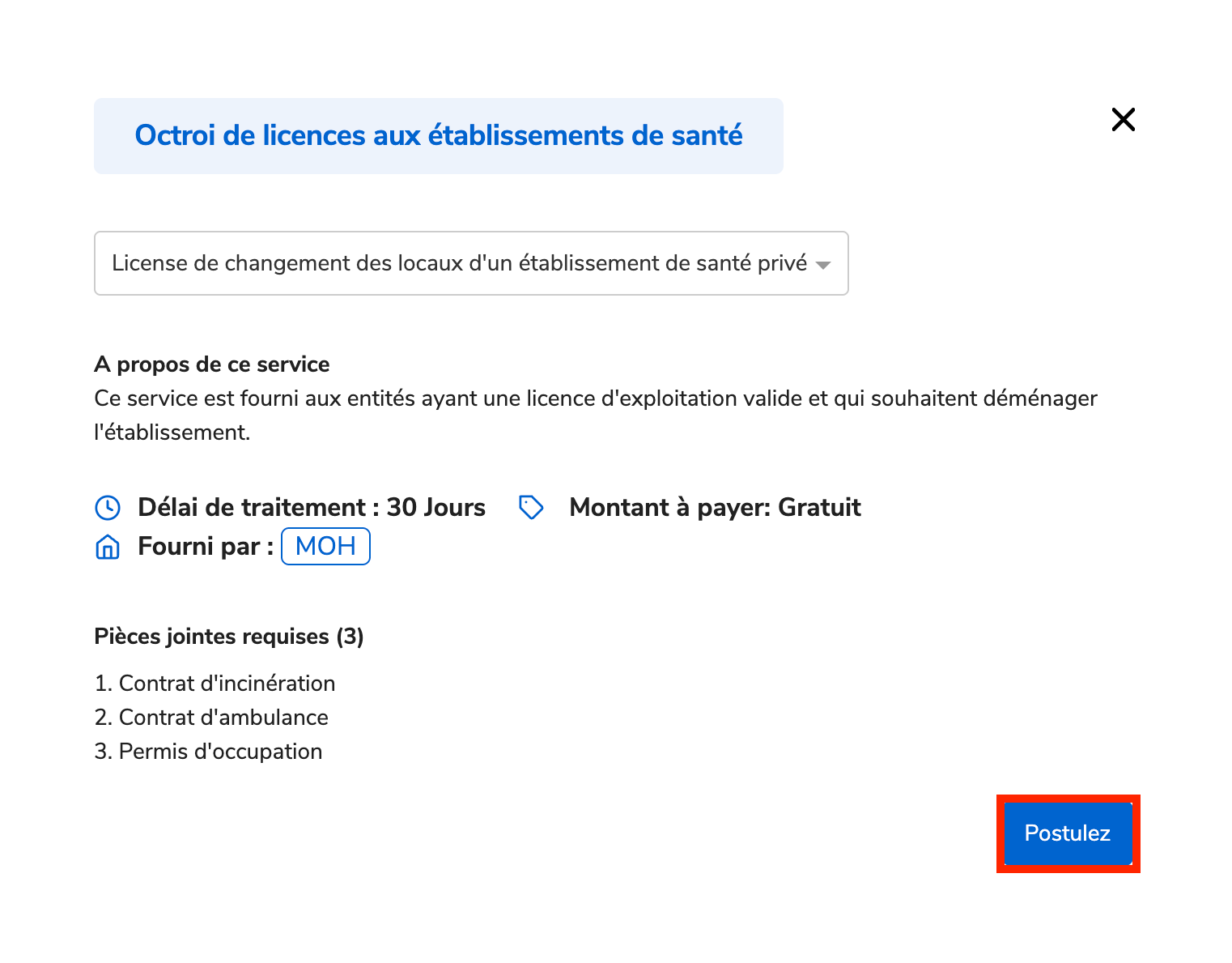 Ce service est destiné aux établissements de santé disposant d’une licence d’exploitation valide et souhaitant transférer leurs activités vers un nouveau site. Ce service est fourni par le Ministère de la Santé.