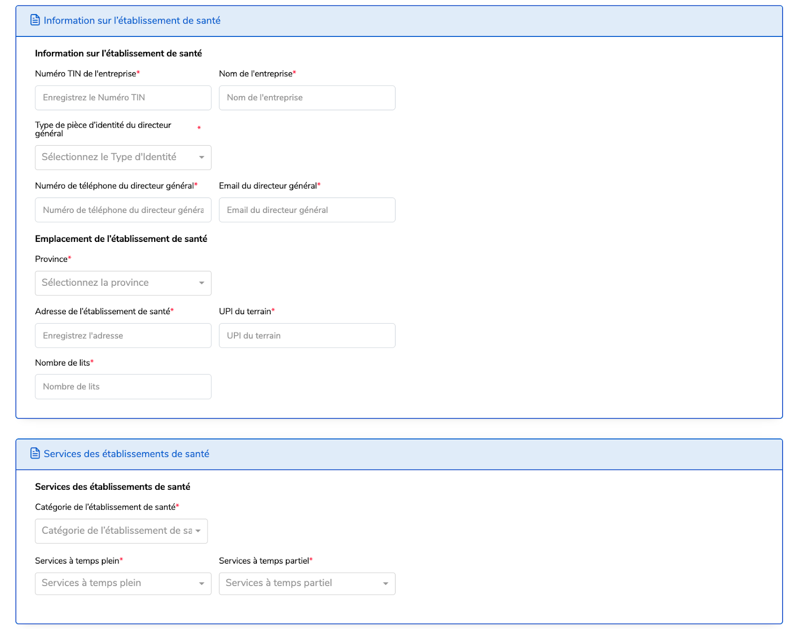 Étape 3 : Renseignez les informations relatives à l’établissement (Numéro TIN, Localisation de l’établissement, Adresse, UPI),Capacité d’accueil. Les champs marqués d’un astérisque * sont obligatoires.