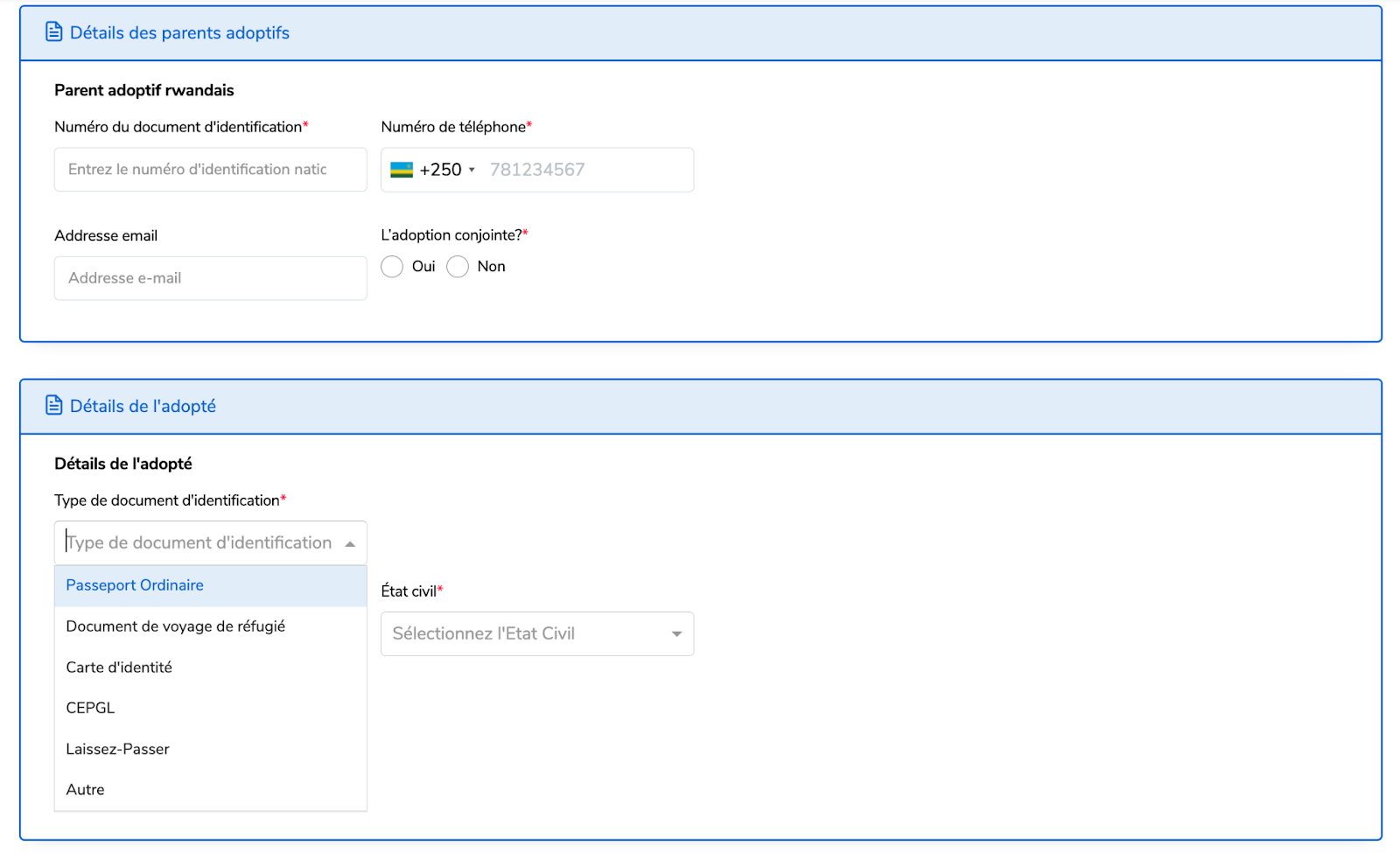 Remplissez les informations des parents adoptifs et de l’adopté, ainsi que le numéro du document d’identification.