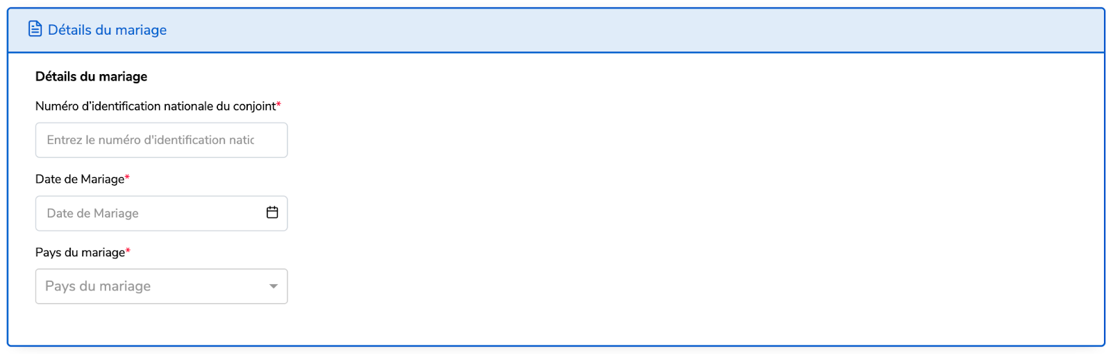 Saisissez le numéro de la carte d’identité nationale du conjoint, ainsi que la date et le pays du mariage.