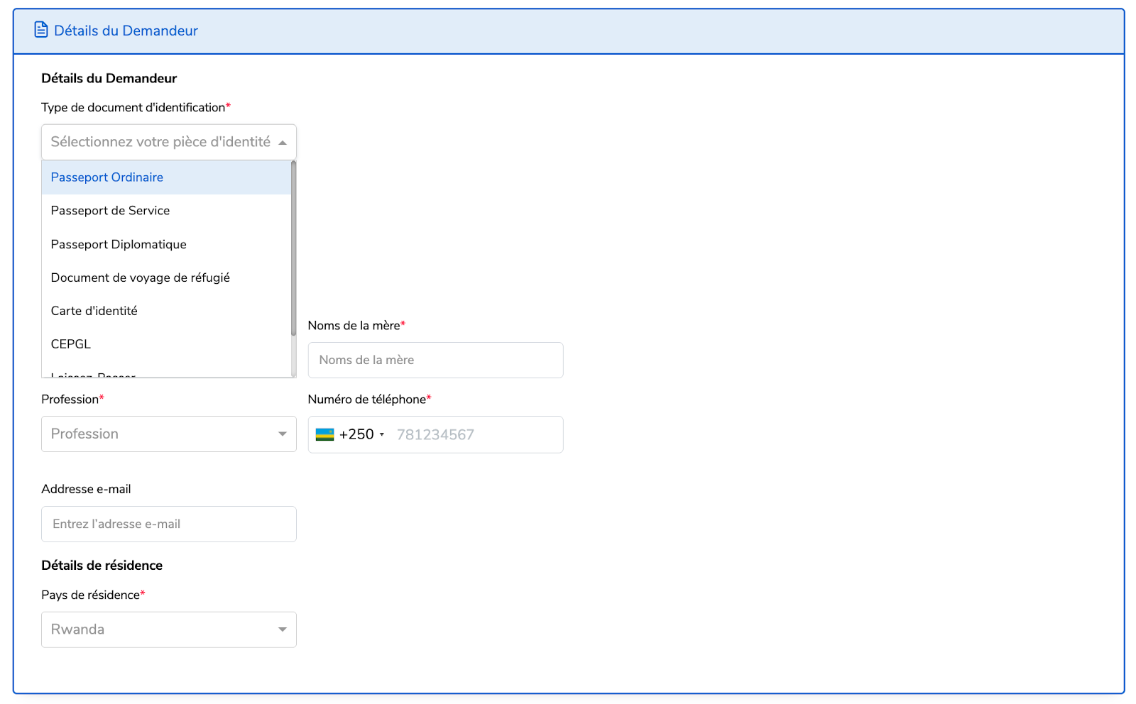 Remplissez les informations du demandeur, le type de document d’identification, les coordonnées de résidence, le numéro de téléphone et l’adresse e-mail.