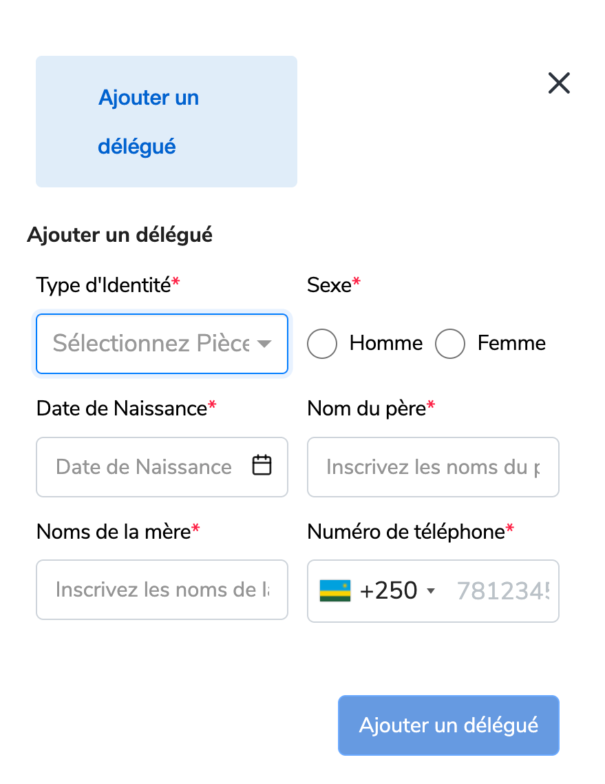 Cliquez sur “Ajouter des détails sur un nouveau délégué”,puis une nouvelle page s'affiche.Veuillez remplir les informations requises.