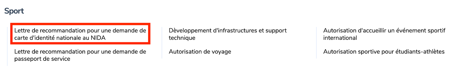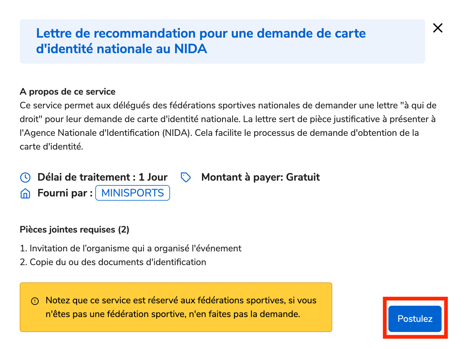 Ce service permet aux délégués des fédérations sportives nationales de demander une lettre "à qui de droit" pour leur demande de carte d'identité nationale. La lettre sert de pièce justificative à présenter à l'Agence nationale d'Identification (NIDA). Cela facilite le processus de demande d'obtention de la carte d'identité. Ce service est fourni par le ministere de sport(MINISPORTS).