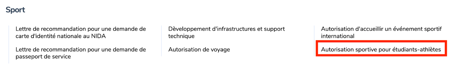 Rendez-vous sur www.irembo.gov.rw ,sous la categorie “Sport”,Choisissez “Autorisation sportive pour étudiants-athlètes ”.