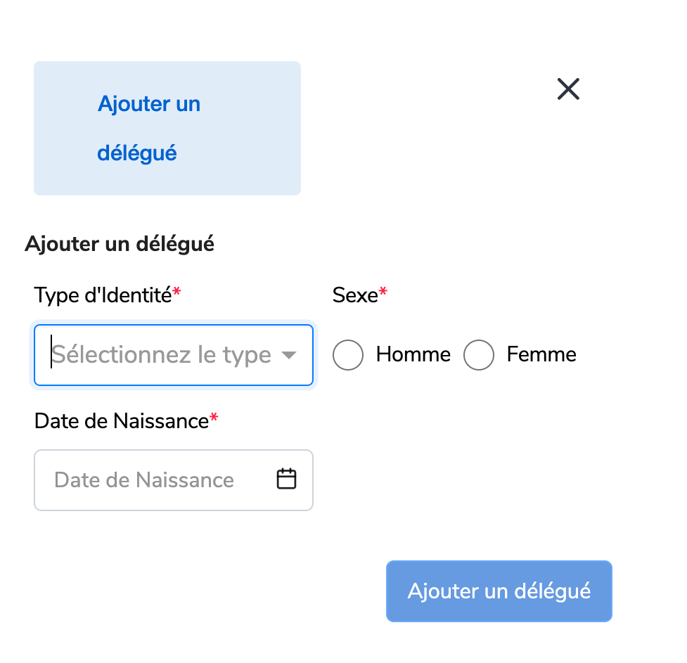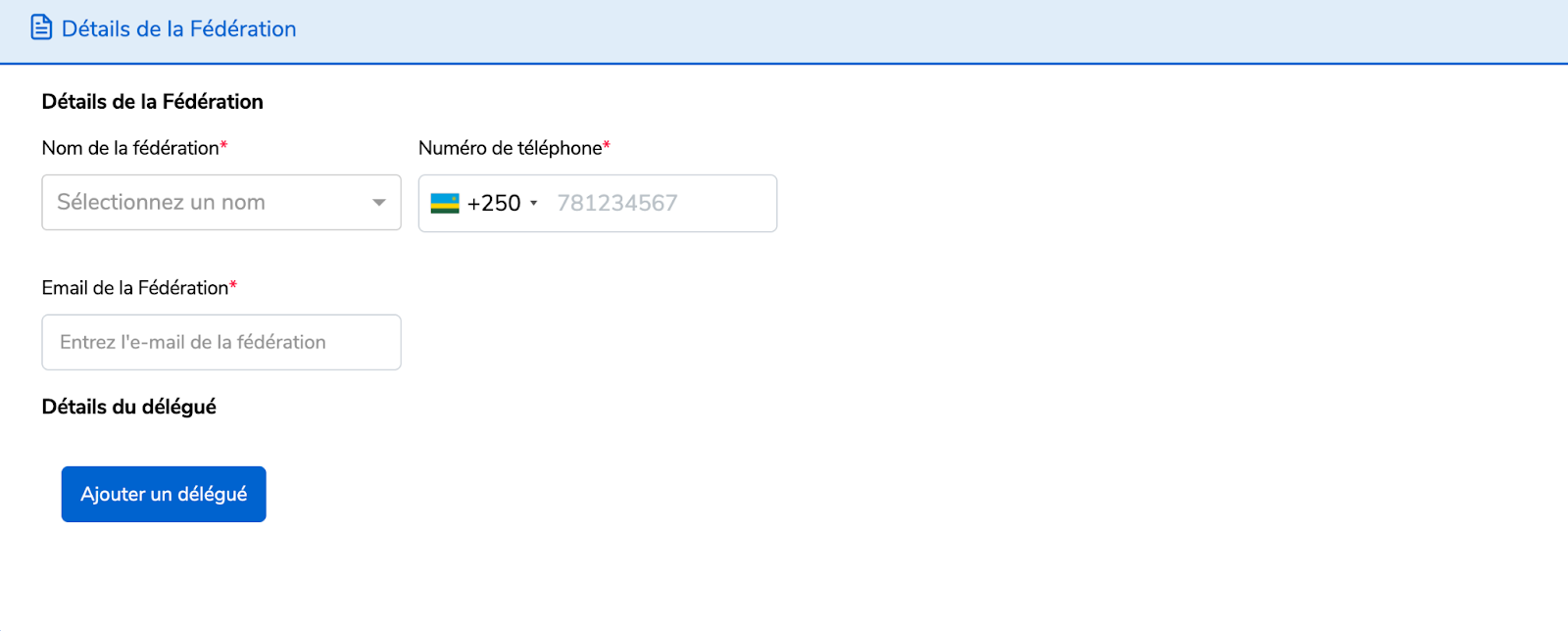 Remplissez les détails de la Fédération,puis cliquez sur “Ajouter un délégué”.