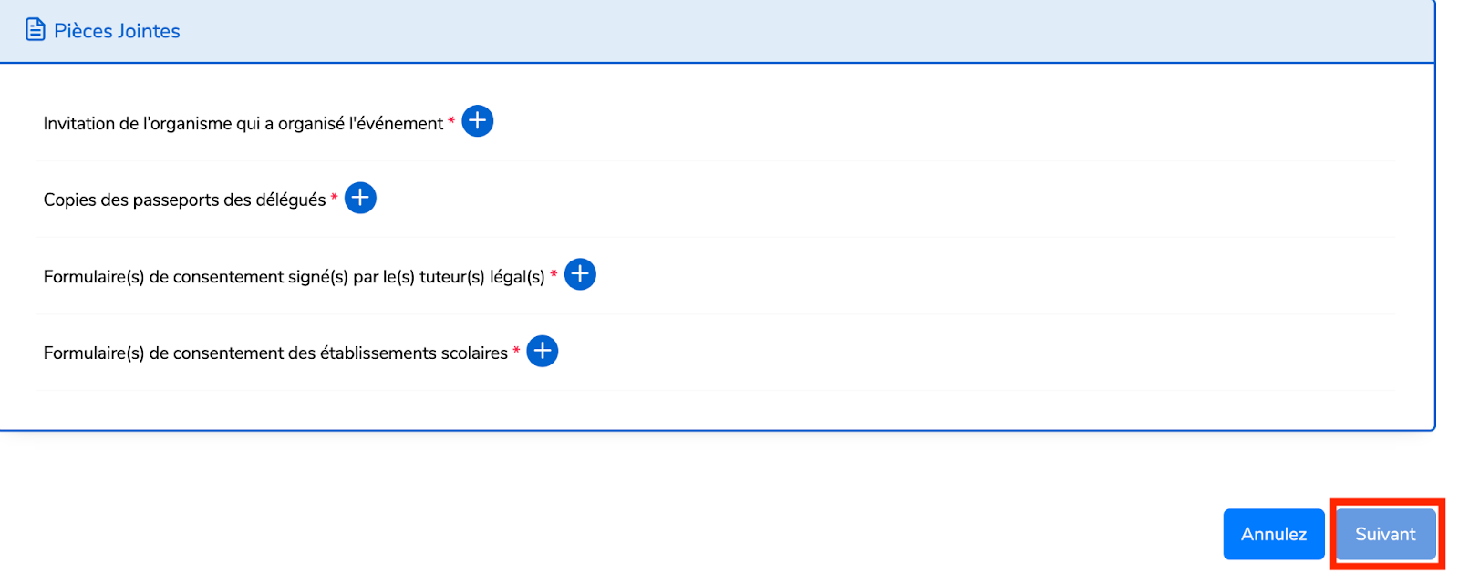 Joignez les pièces jointes requises dans la bonne taille et format,puis cliquez sur “Suivant”.