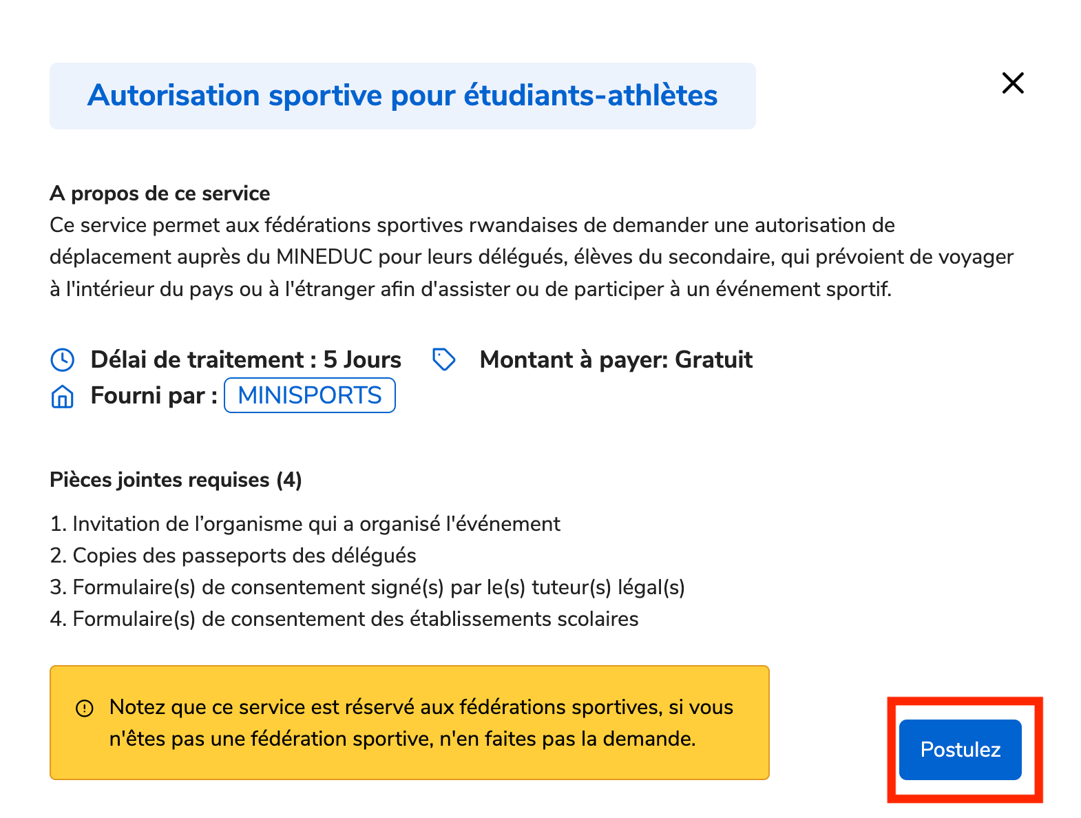 Ce service permet aux fédérations sportives rwandaises de demander une autorisation de déplacement auprès du MINEDUC pour leurs délégués, élèves du secondaire, qui prévoient de voyager à l'intérieur du pays ou à l'étranger afin d'assister ou de participer à un événement sportif.