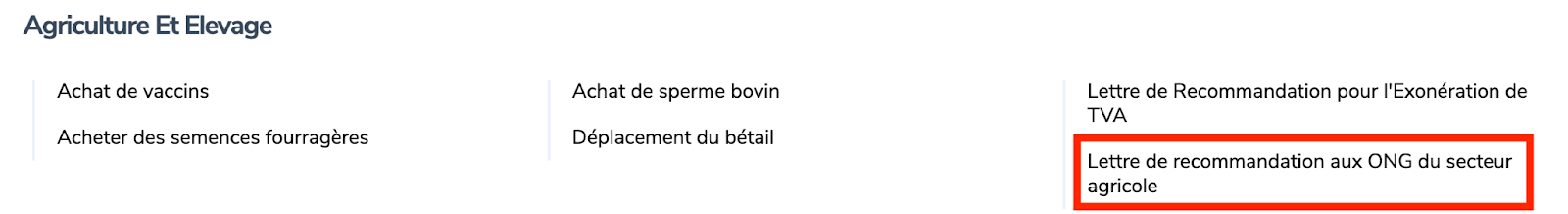 Rendez-vous sur www.irembo.gov.rw , dans la catégorie “Agriculture et Élevage”, choisissez “Lettre de recommandation aux ONG du secteur agricole”.