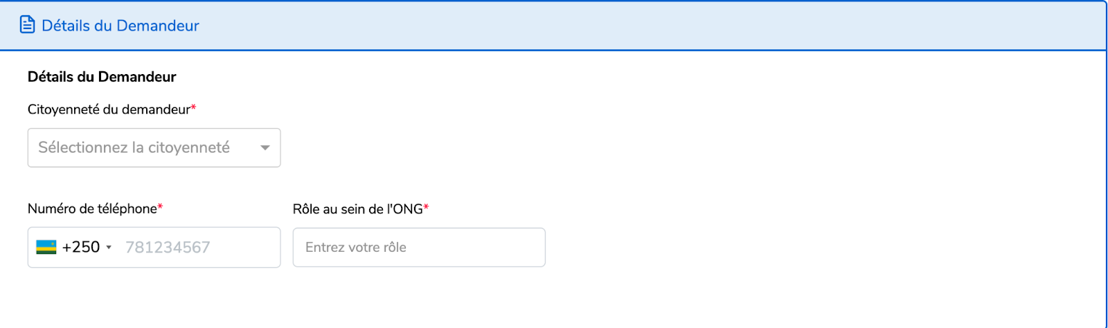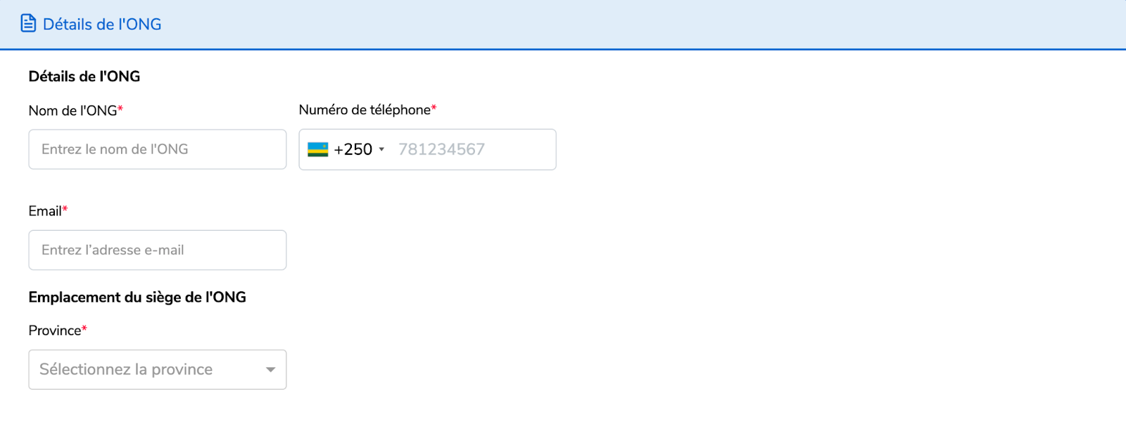 Remplissez les Détails de l’ONG.
