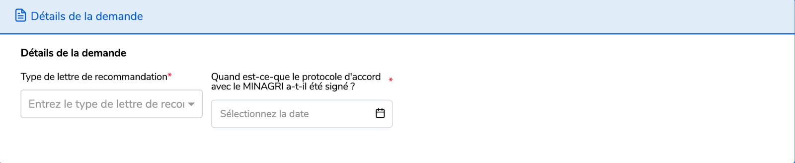 Remplissez les détails de la demande ce qui inclut le type de lettre de recommandation et spécifier quand le protocole d’accord avec le MINAGRI a été signé.