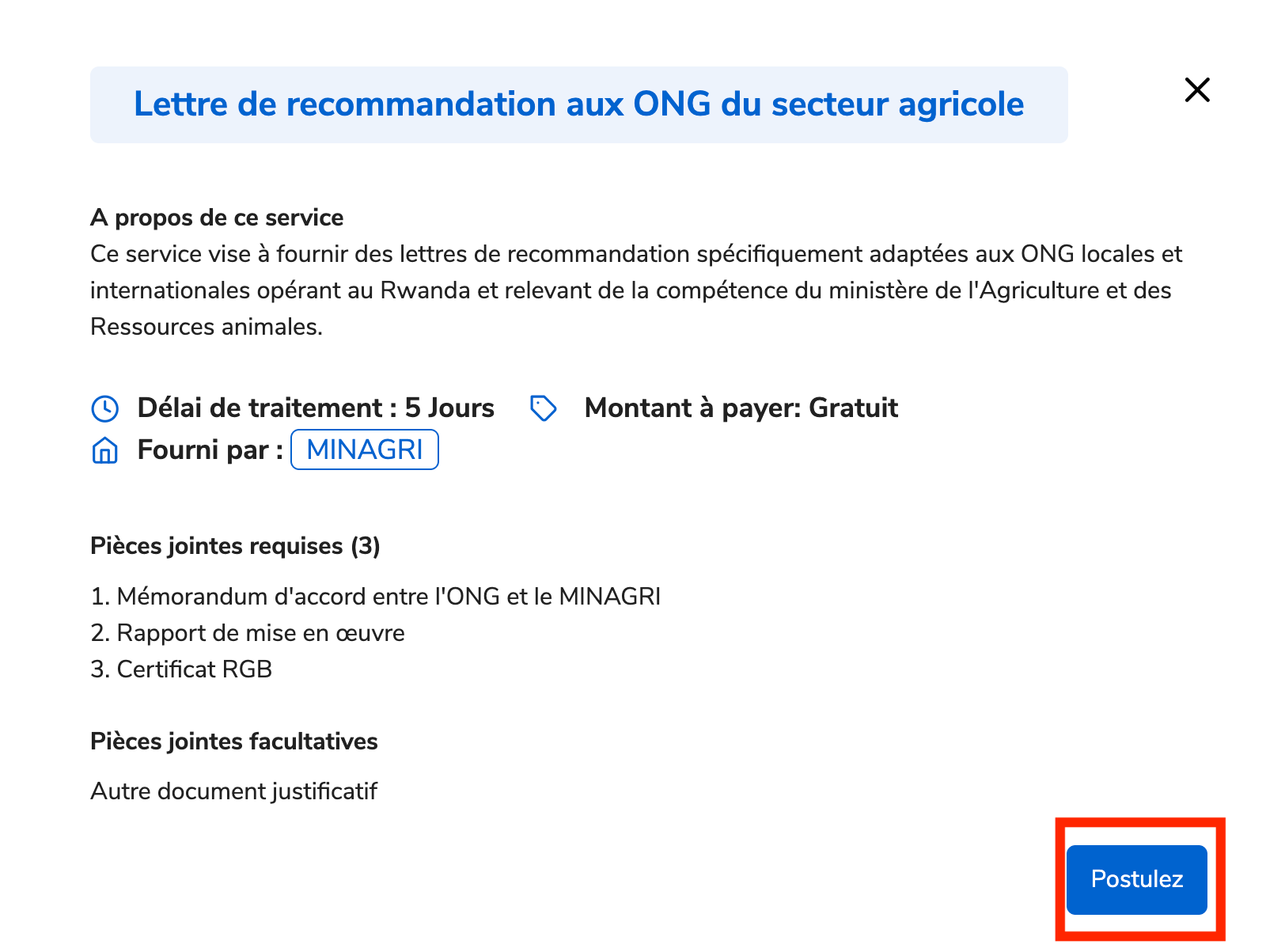 Ce service vise à fournir des lettres de recommandation spécifiquement adaptées aux ONG locales et internationales opérant au Rwanda et relevant de la compétence du ministère de l'Agriculture et des Ressources animales. Ce service est fourni par le ministère de l’Agriculture et des Ressources animales(MINAGRI).