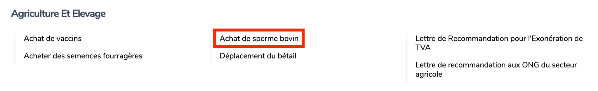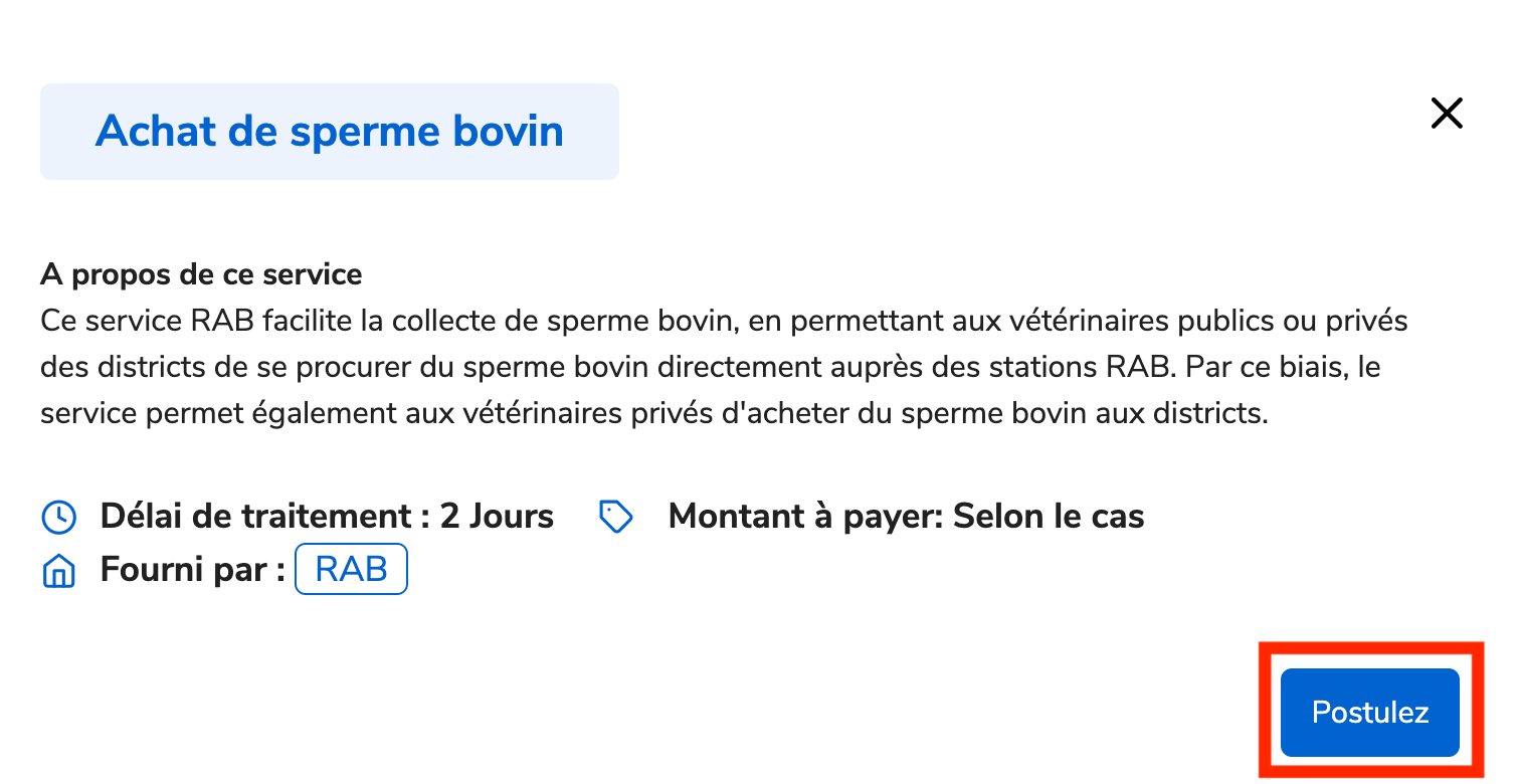 Rendez-vous sur www.irembo.gov.rw ,dans la catégorie “Agriculture et Élevage”,choisissez “Achat de sperme bovin”.