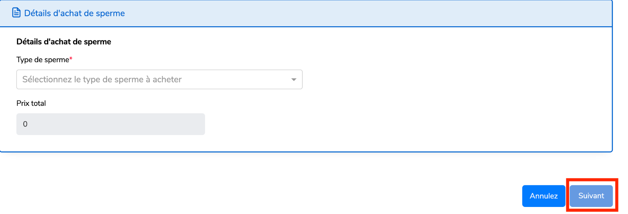 Sélectionnez le type de sperme que vous voulez achetez,remplissez la quantité,et le prix sera affiché dans la case en dessous,puis cliquez sur “Suivant”.