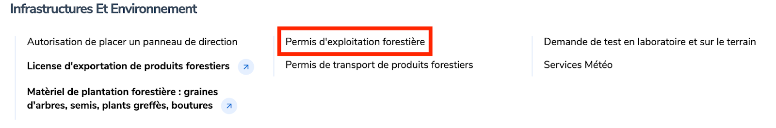 Rendez-vous sur www.irembo.gov.rw , dans la categorie “Infrastructures et Environments”,choisissez “Permis d’exploitation forestière”.