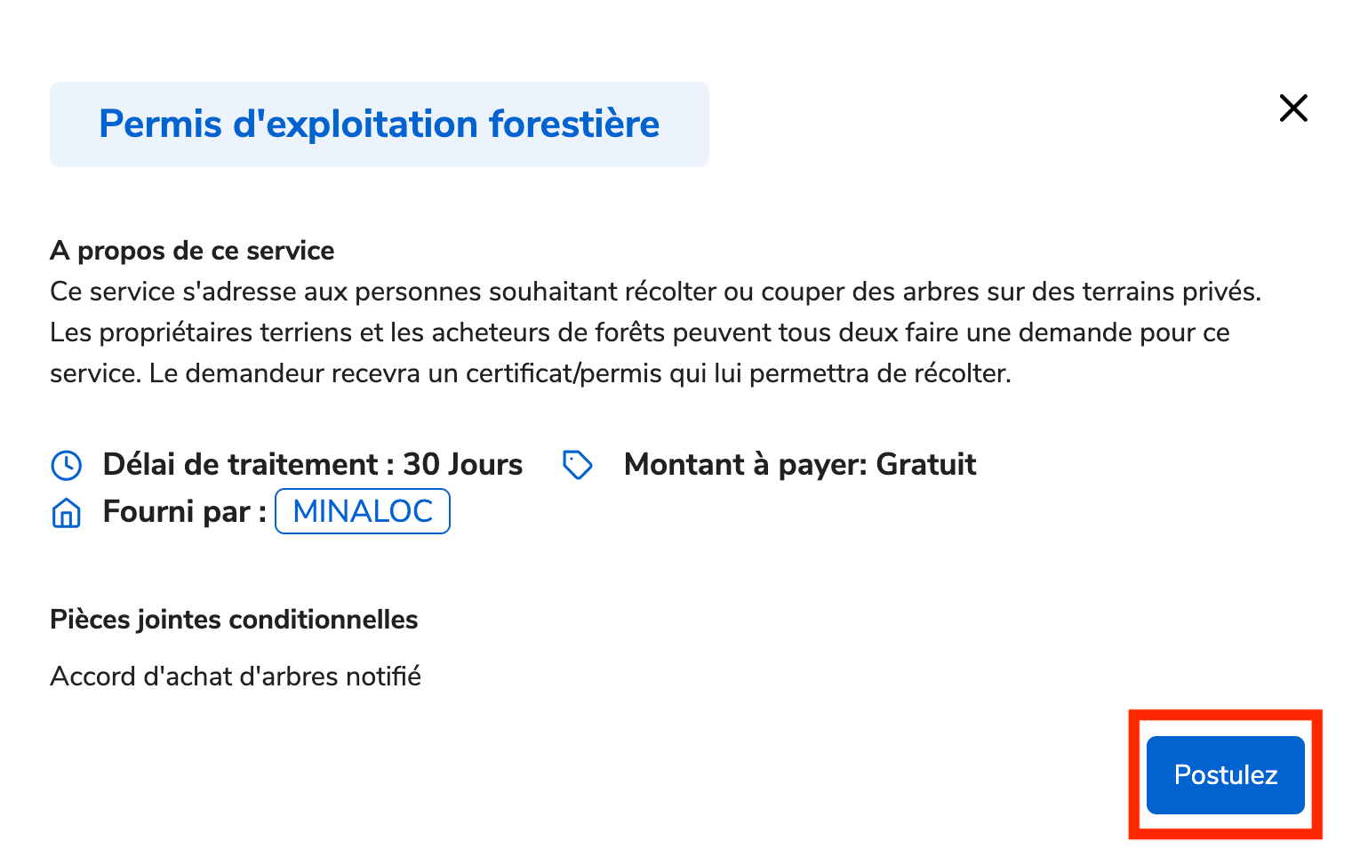 Le délai de traitement est de 30 jours. Ce service est Gratuit.