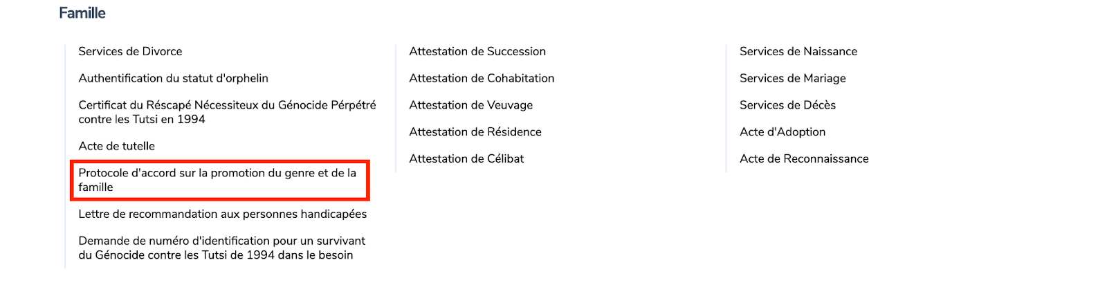 Rendez-vous sur la plateforme IremboGov à l’adresse www.irembo.gov.rw, ensuite connectez-vous à votre compte, sous Famille , sélectionnez le service “ Protocole d’accord sur la promotion du genre et de la famille”.
