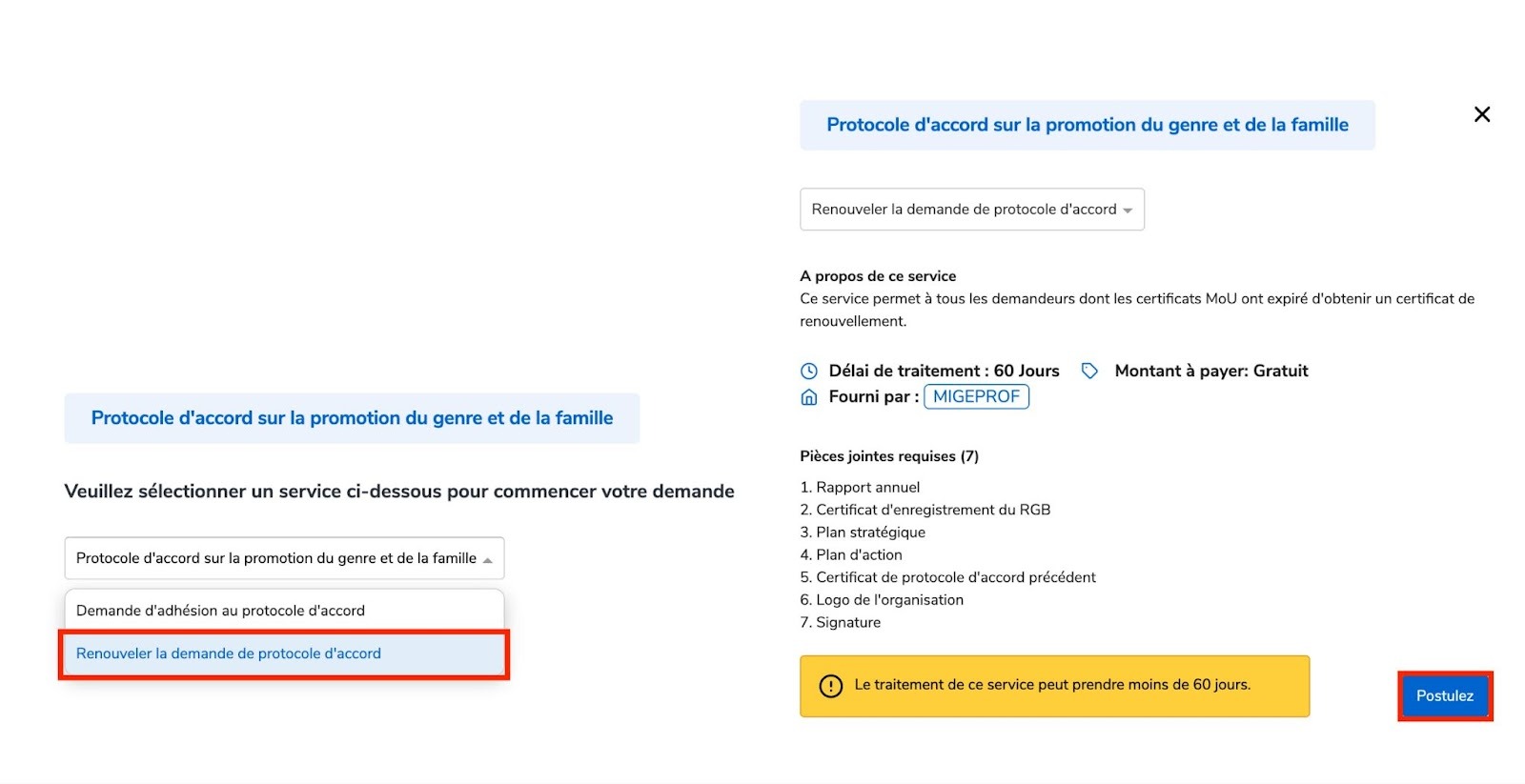 Le renouvellement du protocole d’accord (MoU). Ce service est fourni par le Ministère du Genre et de la Promotion de la Famille (MIGEPROF).