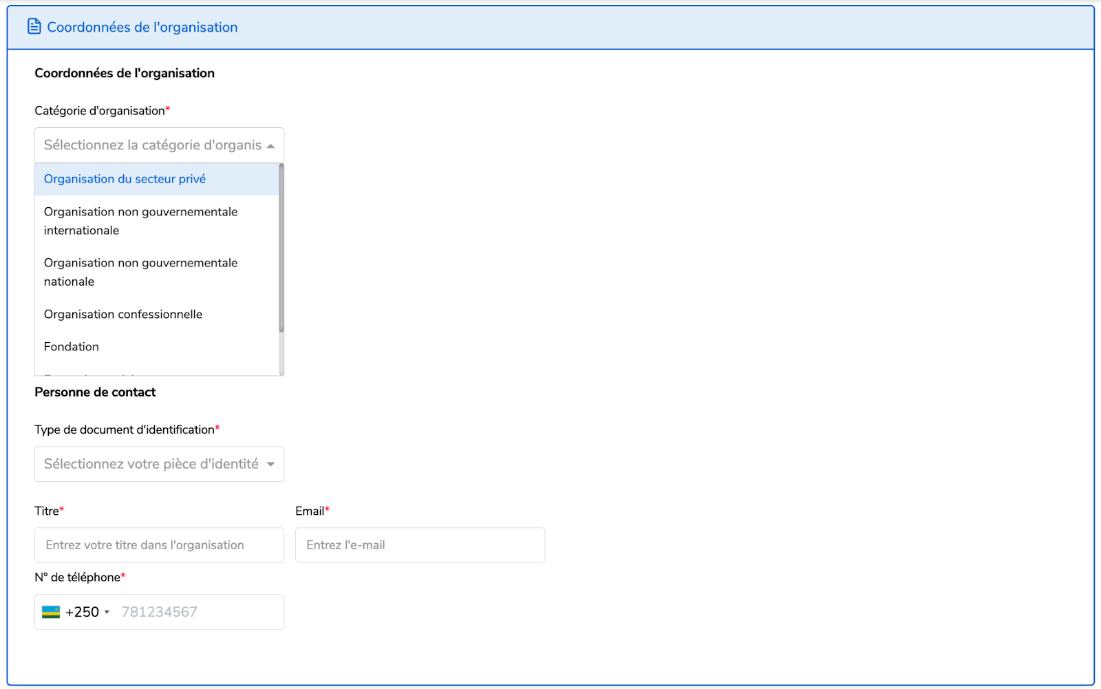 Sélectionnez la catégorie de votre organisation dans le menu déroulant. Remplissez les informations relatives à votre organisation et au contact principal.