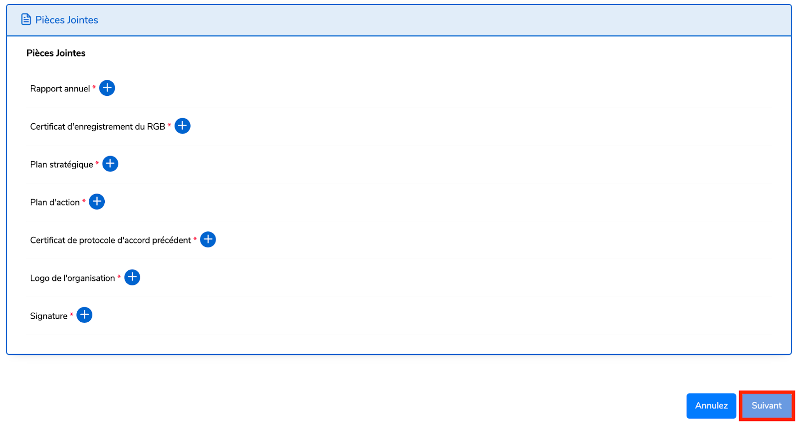 Joignez les pièces jointes requises dans le format approprié et cliquez sur “Suivant”.