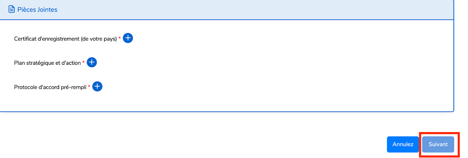 Joignez les pièces jointes requises,puis cliquez sur “Suivant”.