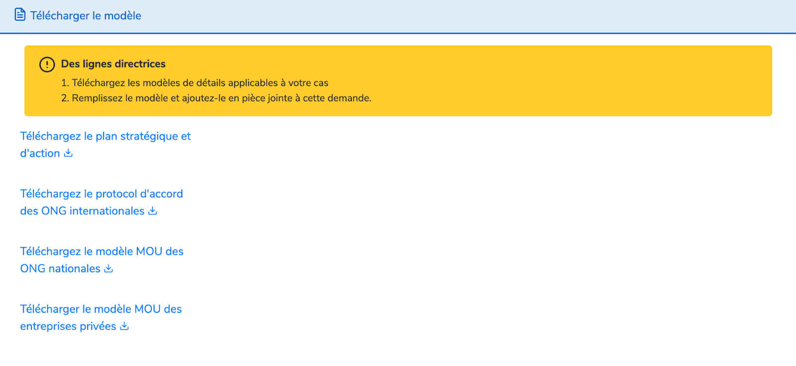 Suivez ces étapes simples pour faire votre demande du “Fourniture de protocole d’accord(MOU) aux ONG internationales, aux ONG nationales et aux entreprises privées dans le domaine de l'éducation.”