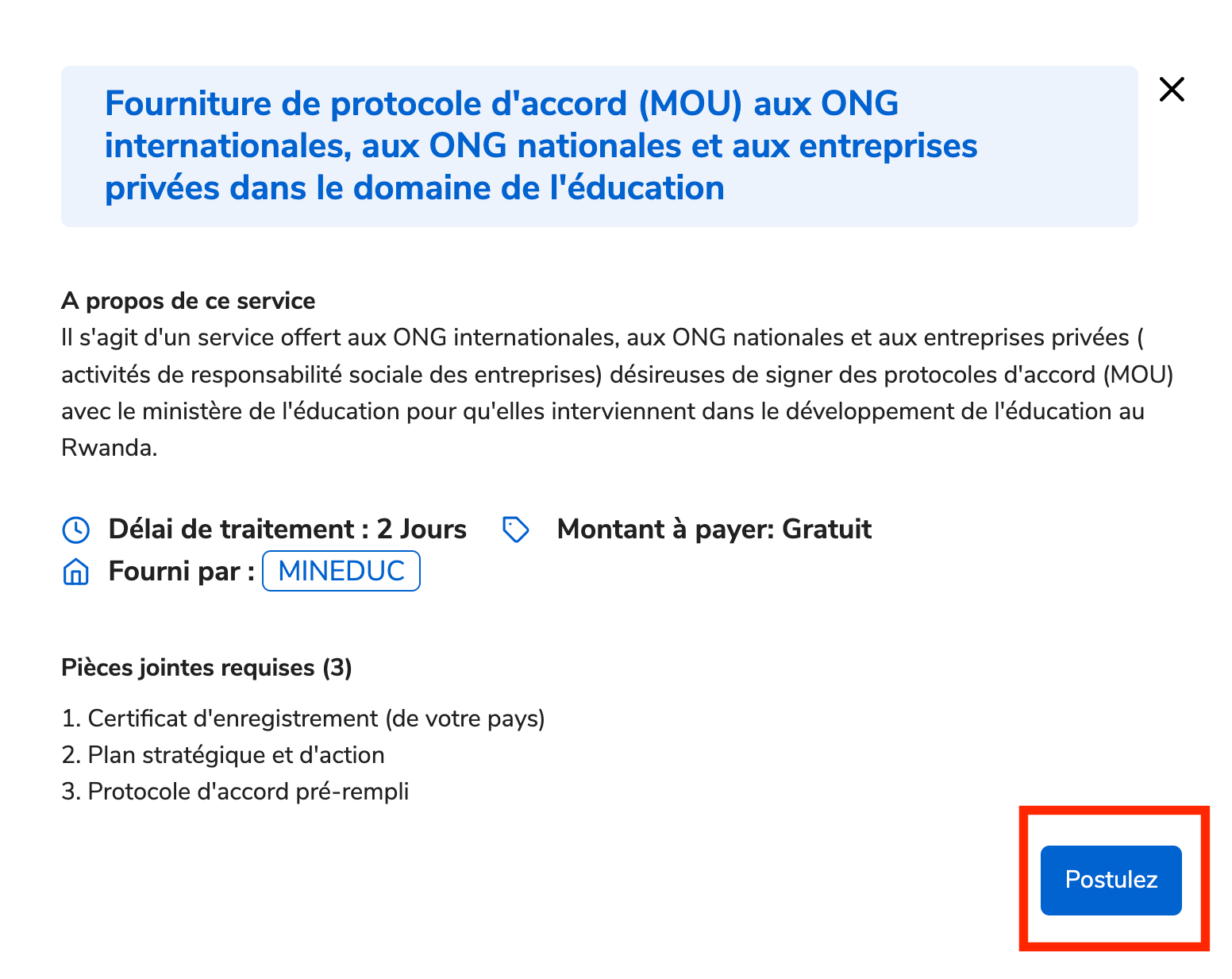 Rendez-vous sur www.irembo.gov.rw et sous la catégorie “Education”,Choisissez “Fourniture de protocole d’accord(MOU) aux ONG internationales, aux ONG nationales et aux entreprises privées dans le domaine de l'éducation.”