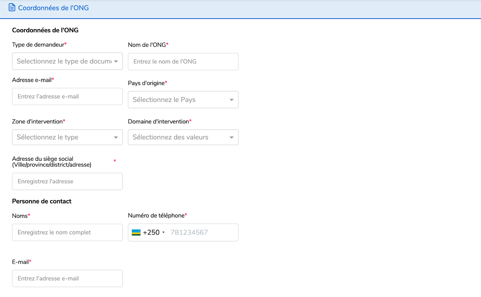 Remplissez les coordonnées de l”ONG,sélectionnez si c’est des ONG internationales,nationales ou entreprises privées. Le nom de l’ONG et son adresse du siège social.