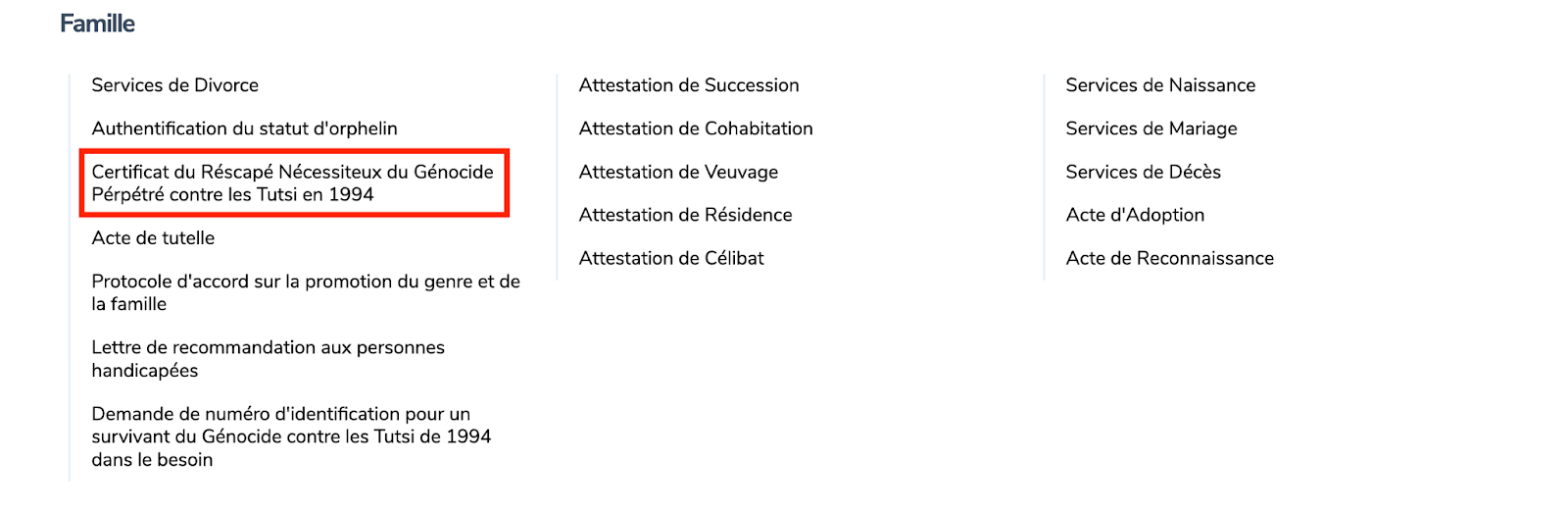 Étape 1 : Rendez-vous sur la plateforme IremboGov à l’adresse www.irembo.gov.rw, ensuite connectez-vous à votre compte, sous “ Famille ” , sélectionnez le service “Certificat du Réscapé Nécessiteux du Génocide Pérpétré contre les Tutsi en 1994”.