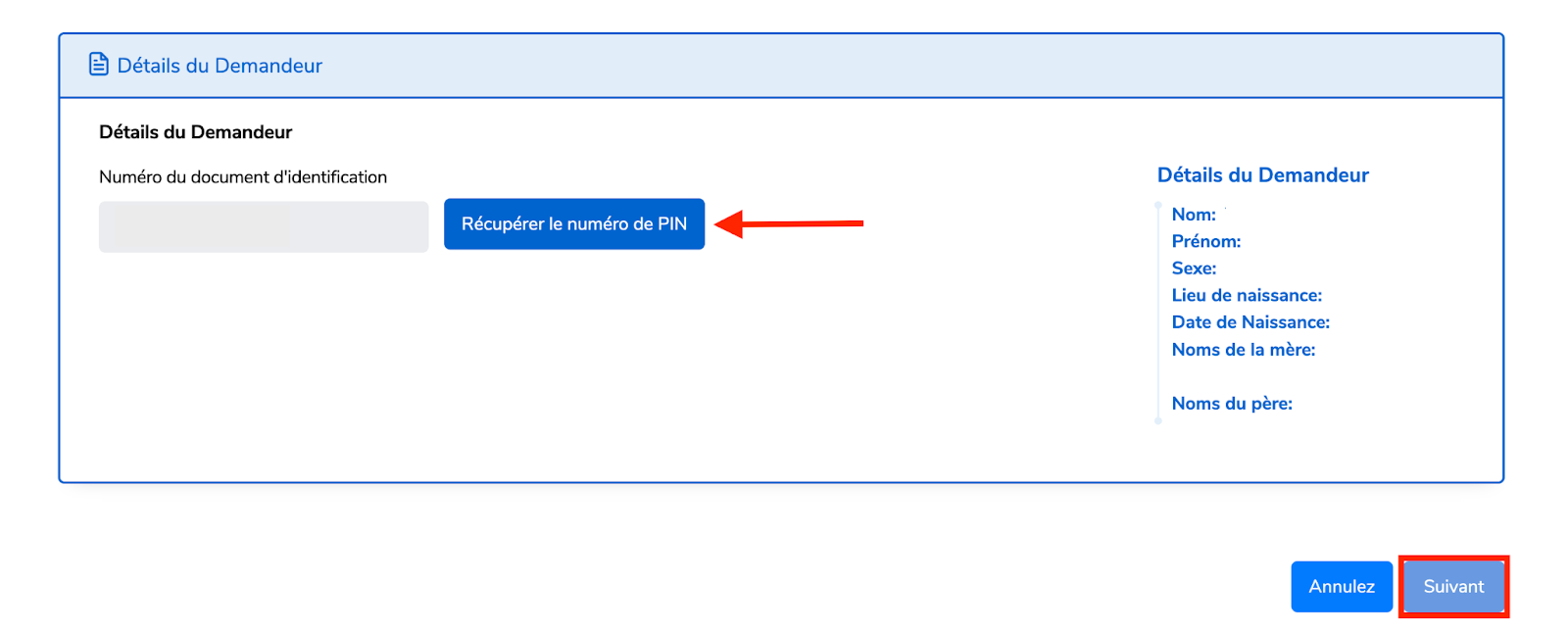 Étape 3 : Renseignez les informations du demandeur, puis cliquez pour récupérer le numéro du PIN. Une fois le numéro PIN récupéré avec succès, cliquez sur “Suivant”.