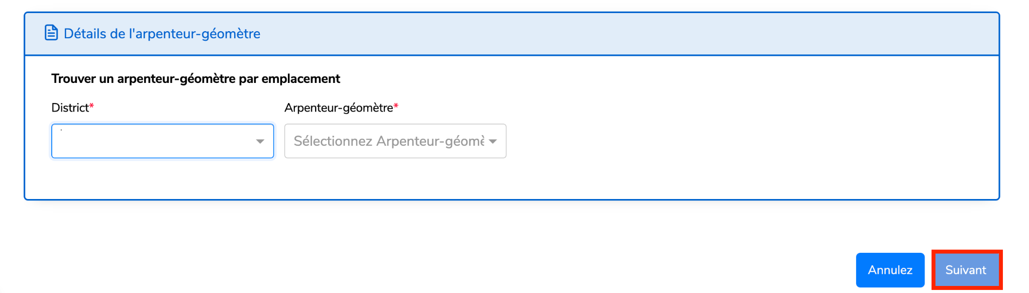 Sélectionnez les informations de l’Arpenteur-géomètre et cliquez sur Suivant pour continuer.