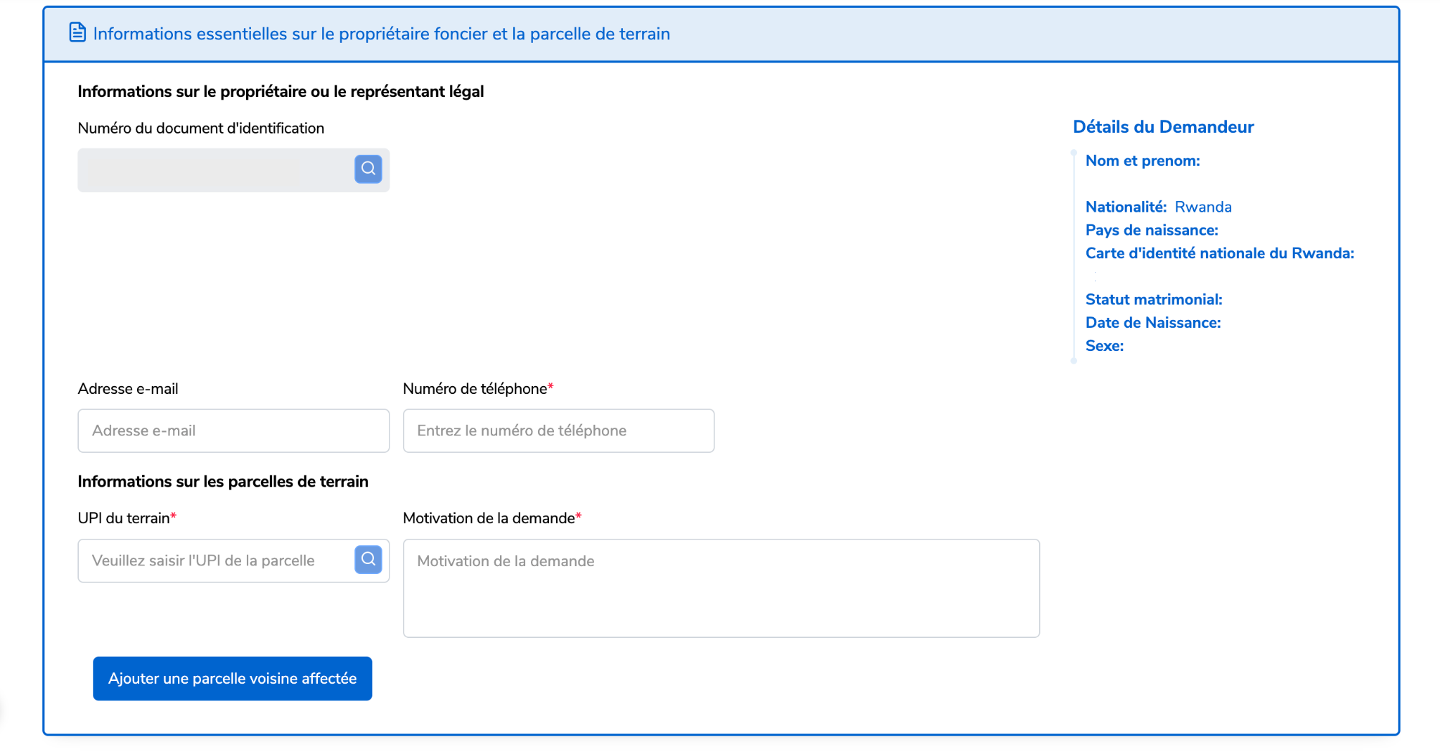 Remplissez les informations essentielles du propriétaire et de la parcelle (Numéro d’Identification Nationale, Passeport, Numéro de demande NPR). Ensuite, saisissez l' UPI et le motif de la demande.