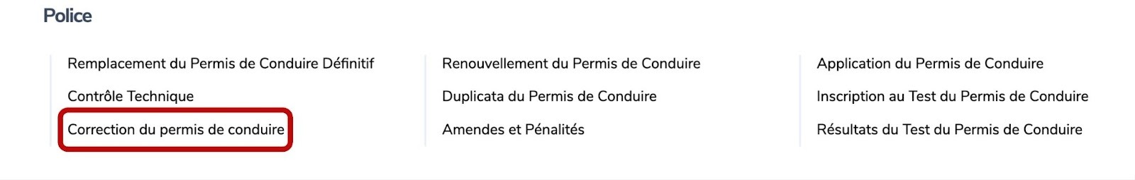 Étape 1 : Rendez-vous sur www.irembo.gov.rw et, sous la catégorie Police, cliquez sur Correction du permis de conduire.