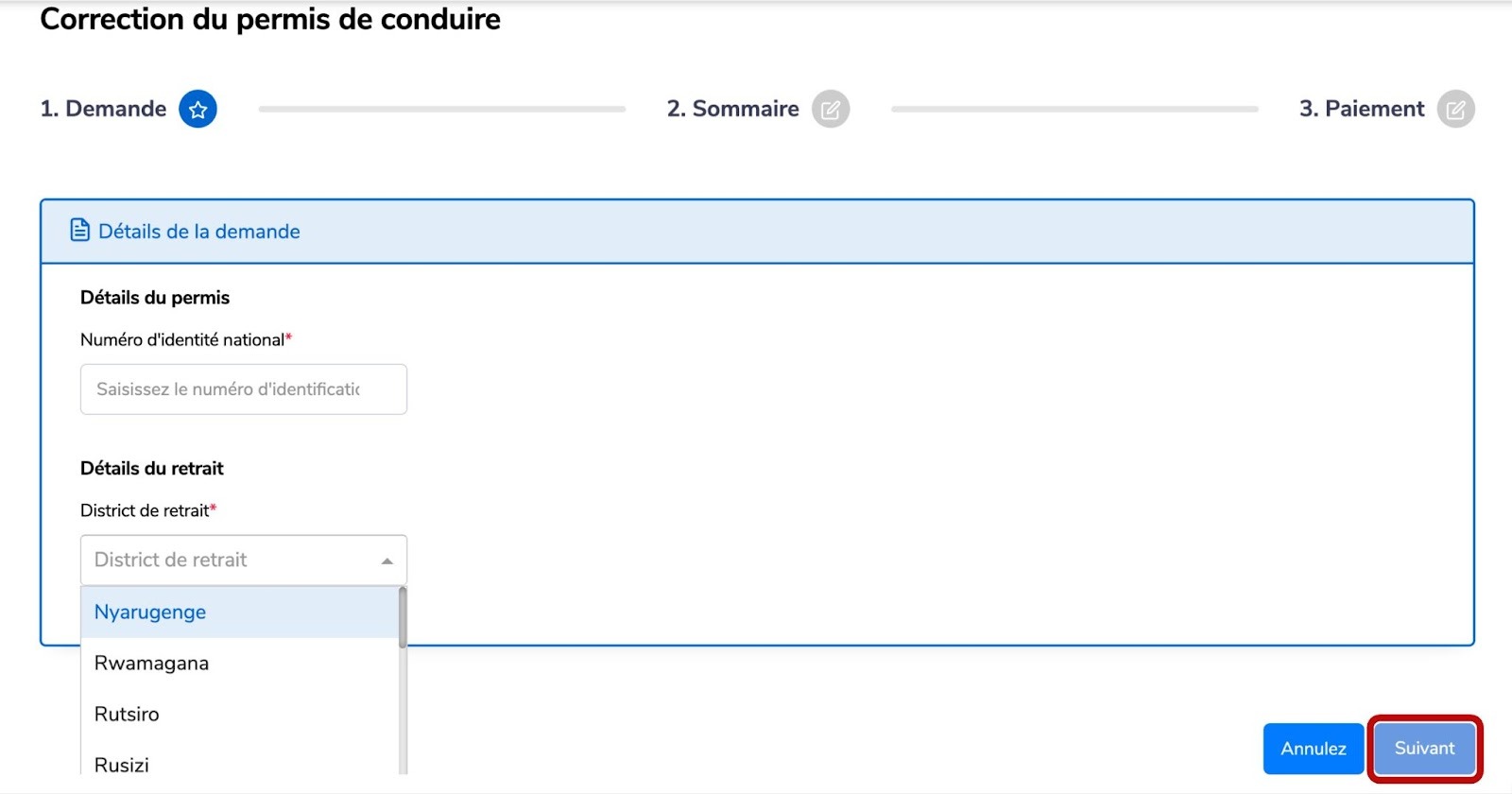 Étape 3 : Saisissez les détails de votre demande (numéro de permis de conduire, numéro d'identifiant national et district de retrait).