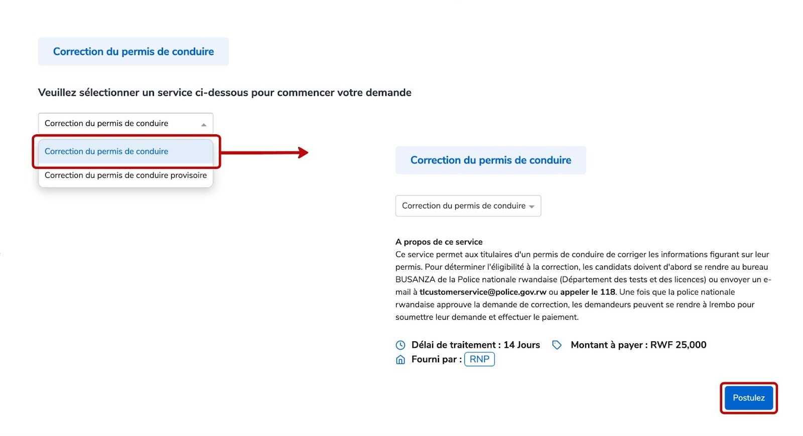 Ce service permet aux titulaires d'un permis de conduire de corriger les informations figurant sur leur permis. Pour déterminer l'éligibilité à la correction, les demandeurs doivent d'abord se rendre au bureau de la Police nationale du Rwanda à BUSANZA (Département des examens et des permis) ou envoyer un e-mail à tlcustomerservice@police.gov.rw ou appeler le 118. Une fois la demande de correction approuvée, les demandeurs peuvent se rendre sur Irembo pour soumettre leur demande et effectuer le paiement.