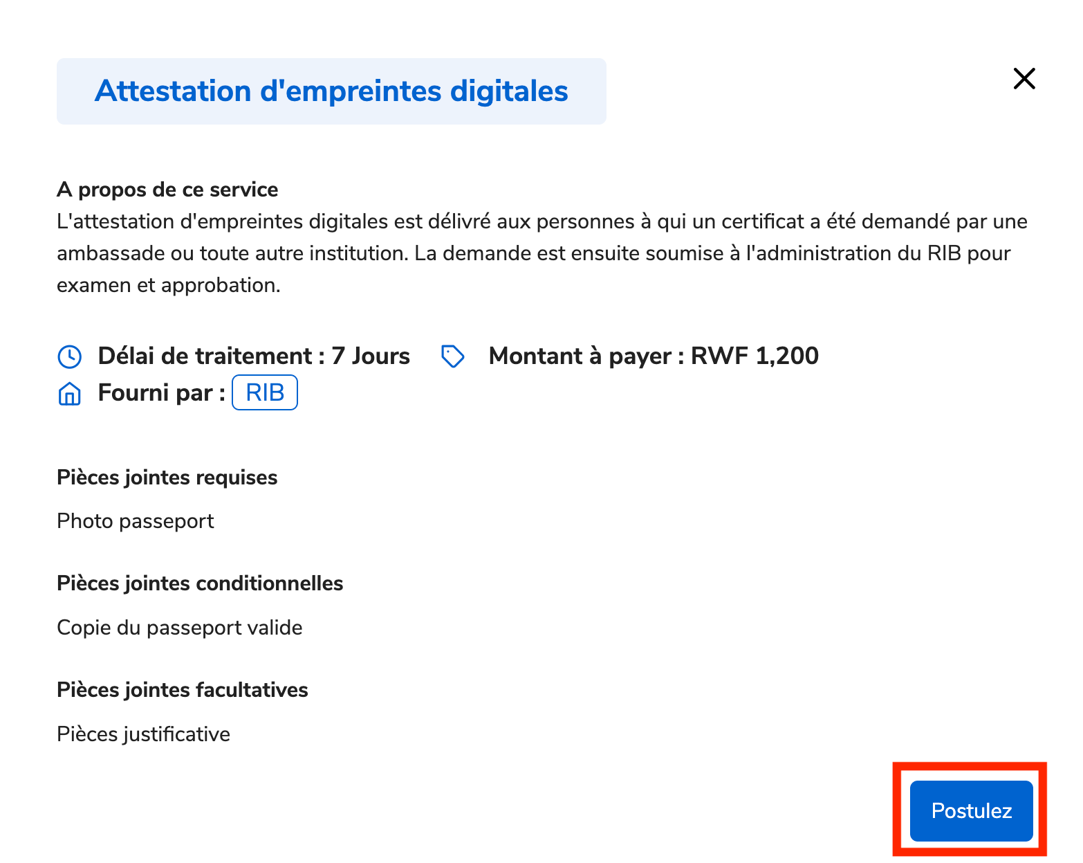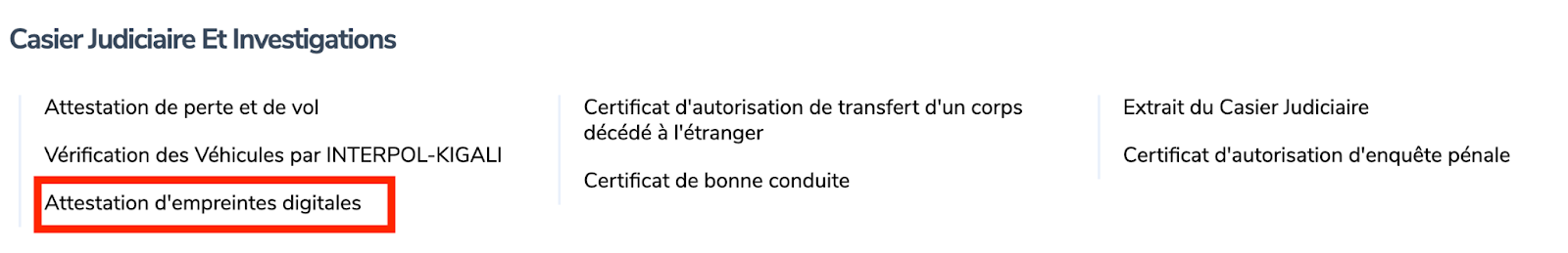Rendez-vous sur www.irembo.gov.rw , dans la catégorie “Casier Judiciaire et Investigations”,choisissez “Attestation d’empreintes digitales”.