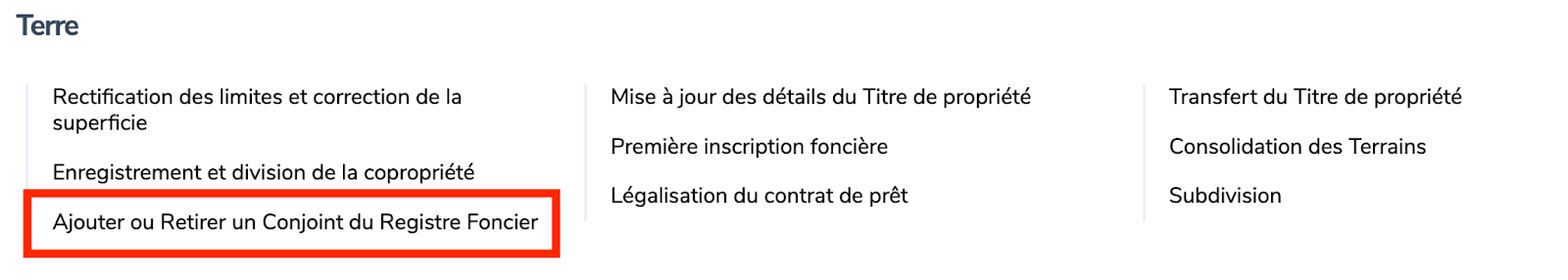 Sous “Terre”, Choisissez “Ajouter ou Retirer un Conjoint du Registre Foncier”.