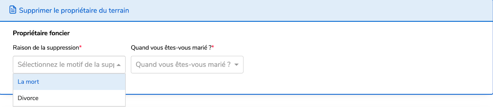 Lorsque vous sélectionnez “Supprimer le propriétaire foncier”,veuillez indiquer la date de votre mariage ainsi que le motif de la suppression.
