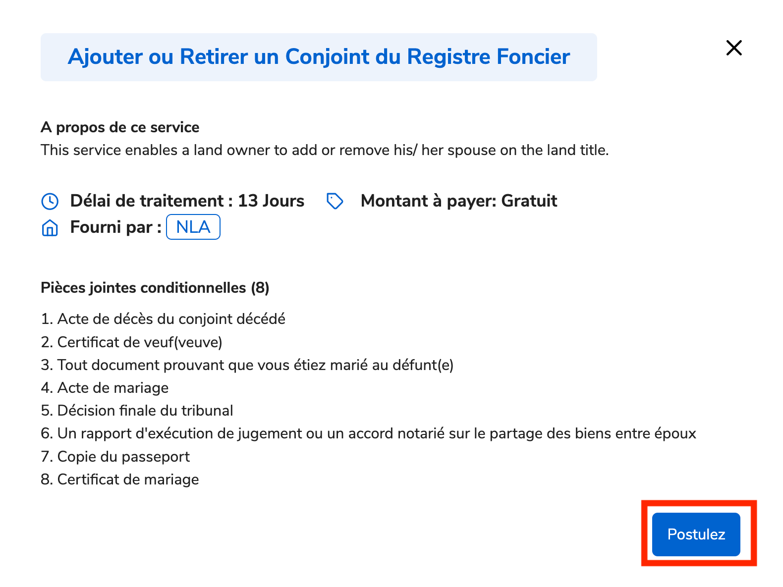 Ce service permet au propriétaire foncier d'ajouter ou de retirer son conjoint sur le titre foncier. Ce service est fourni par National Land Authority (NLA).