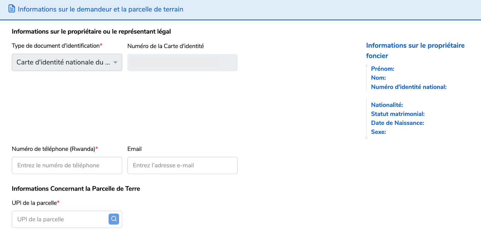 Remplissez les informations sur le demandeur et la parcelle de terrain. Et l’UPI de la parcelle.Les détails du demandeur s’afficheront a la droite du page.